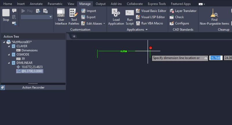 Las macros de acciones se graban mediante la Grabadora de acciones ubicada en la pestaña “Administrar” de la cinta. Piense en Action Recorder como la versión de AutoCAD de una grabadora de audio o una grabadora de video digital (DVR).